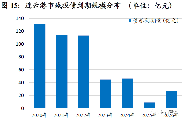 从区域分布看,市本级平台数量6家,债券余额184.7亿,占比35.6%。其次连云区平台有3家,存量债207.6亿,占比40.4%;海州区、赣榆区平台各2家,债券余额仅20.58亿和25.5亿;县市中,灌云县、灌南县发债平台有3家和1家,债券余额47.5亿和28.1亿,东海县暂无城投发债平台。