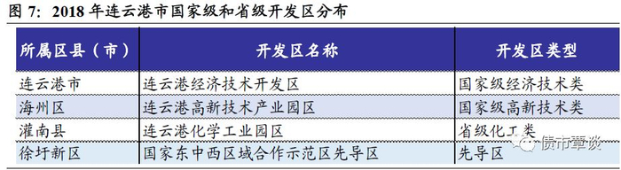 连云港经开区:1984年设立的首批国家级经开区之一,为连云港市重要的工业集聚区,2018年在全国219家国家级经开区排名第23位。经开区临海临港,区内土地多为盐田和滩涂,拥有相对充足的土地资源。以生命健康、先进材料、临港装备制造为3大支柱产业。目前已有美国杜邦、日本三菱、中国建材等40多家世界500强企业投资;已建成全国最大抗肿瘤药物、抗肝炎药物和现代中药生产基地,正加快建设万吨级碳纤维生产基地。规上工业企业109家,纳税过千万企业32家。18年GDP为325.98亿,增速8.2%;投资增长10.2%;规上工业总产值726亿,增长9.6%。