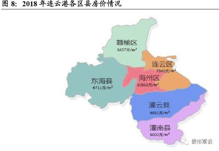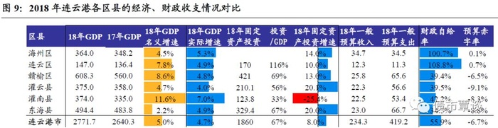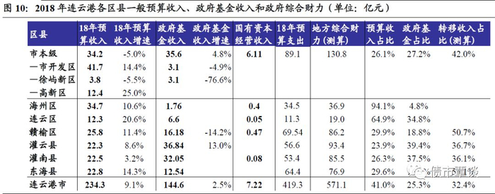 从地方综合财力和来源结构看,①从综合财力看,各区县整体相对偏弱,灌云县、赣榆区、灌南县在85-95亿左右,综合财力排名居前,而连云区、海州区综合财力相对较弱,不足50亿;②从18年政府性基金收入看,超过30亿的只有市本级、灌云和灌南县,其余区县整体较少。