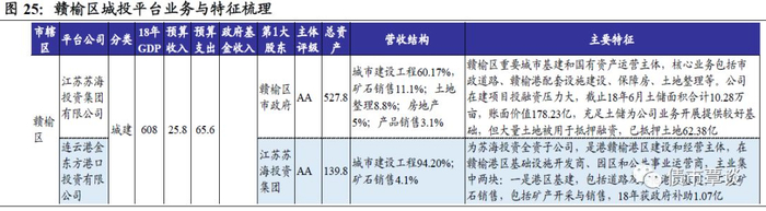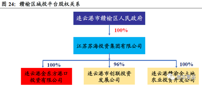赣榆区城投平台有4家,分别为苏海集团、连云港金东方港口投资公司、连云港市创联投资发展公司、连云港赣榆金土地农业投资开发公司,后3家平台均为苏海集团子公司。其中发债平台2家,主体均为AA,核心平台为江苏苏海投资集团,为赣榆区重要城市基建和国有资产运营主体,核心业务包括市政道路、赣榆港配套建设、保障房、土地整理等;其全资子公司连云港金东方港口投资有限公司,是港赣榆港区建设和经营主体。