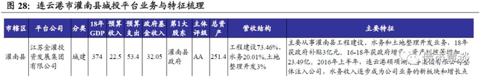 灌南县唯一核心发债平台为江苏金灌投资发展集团,主要从事灌南县工程建设、水务和土地整理开发业务,另有部分收入来自资金拆借、物业租赁、广播电视、金融担保等,但占比较小。2016年上半年,连云港硕项湖水务集团有限公司整体注入公司,水务收入逐步成为公司业务的新板块和增长点。资产248.57亿元,主体AA。在建基建较多,未来收入有保障,18年底在建拟建工程投资45.39亿元,尚需33.48亿。拥有土地使用权8.89万亩,账面价值112.76亿,未抵押占50%。此外,公司负责县域82万人生活供水和污水处理,有较强垄断优势。18年政府补贴3亿,16-18年获政府增资、资产划拨等增加23.49亿。18年末受限资产59.83亿,占总资产24.11%;19年3月末,对外担保54.01亿,担保率36.49%,被担保企业有一家为民企,担保额4亿,占比7.4%;19年6月末,获银行授信61.11亿,未用22.85亿。
