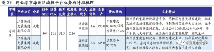 海州区发债城投有2家,主体均为AA,其中核心平台为江苏海州发展集团,承担区内重大项目建设、棚改及城市基础设施建设任务,得到海州区政府大力支持;其全资子公司江苏瀛洲发展集团,从事海州区重要基础设施、保障房建设。