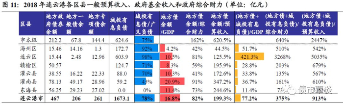 债务风险:2018年末连云港市地方债务余额467亿,其中一般债206亿、专项债261亿,地方债务余额/GDP为16.8%,地方债务余额/综合财力为82%。考虑发债城投有息负债作为隐性债务的替代变量,以“广义地方总债务/地方综合财力”衡量的广义债务率水平,连云港市整体为375%,其中市本级、连云区、海州区债务压力相对较高。