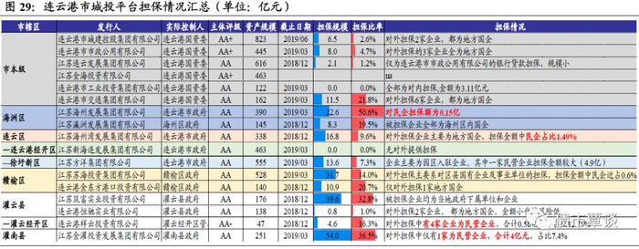 我们根据最新公告、年报、评级报告等梳理了连云港市市本级、区级、园区等平台担保情况,在汇总的17家城投主体中,担保率在50%以上的有1家,整体担保率水平不高;但部分平台被担保对象有民企,城投担保风险值得关注,总结情况如下表所示: