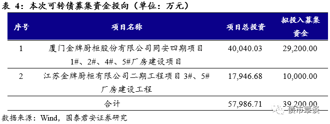 公司本次发行可转债拟募集资金总额不超过3.92亿元,将主要用于厦门金牌厨柜股份有限公司同安四期项目1#、2#、4#、5#厂房建设项目和江苏金牌厨柜有限公司二期工程项目3#、5#厂房建设工程。