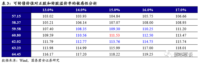【条款分析】本次可转债发行期限6年,票息为递进式(0.4%,0.7%,1.0%,1.5%,3.0%,3.5%),到期回售价为118元(含最后一期利息)。主体评级为AA-,转债评级为AA-,按照6年AA-中债企业债 YTM 6.94%计算,纯债价值为82.83元,YTM为3.81%。发行6个月后进入转股期,初始转股价62.69元,12月11日收盘价为60.8元,初始平价96.99元。条款方面,15/30+80%的下修条款,15/30+130%的有条件赎回条款,30/30+70%的回售条款。可转债潜在稀释比率约为9.33%。