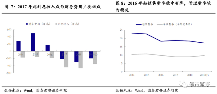 2017年起利息收入成为财务费用主要组成部分。公司2014-2016年的利息收入相对比较稳定,在160-180万元左右。从2017年起,公司利息收入大幅上涨,2017和2018两年均超过400万元,并相应导致财务费用由正转负,其原因主要为公司将部分暂时闲置的资金用于购买通知存款、结构性存款等产品,从而增加了利息收入。