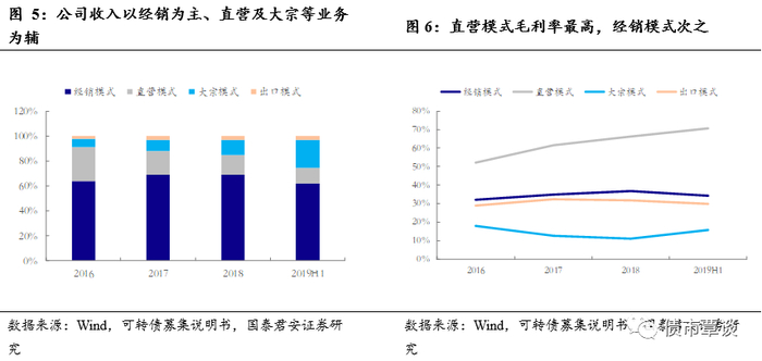 经销为主、直营及大宗等业务为辅。公司的销售方式分为四种,经销、直营、大宗和出口。公司以经销模式为主,经销模式带来的收入占比超过60%,主要受益于公司品牌市场认可度的提升和产品销售结构的优化,经销模式毛利率稳中有升,位居第二。公司以直营和大宗模式为辅,直营模式近年来收入贡献占比有所下降,2019年上半年下降至12.36%,但直营模式的毛利率是四种模式之最,2019年上半年高达70.5%,主要系直营模式为公司直接面向终端客户进行销售,销售价格较高。大宗模式近年来收入占比快速提高,2019年上半年上涨至22.42%,但该模式毛利率较低,主要系公司为了获得市场份额,前两年公司在价格上给予大宗客户一定让利,因此2017年和2018年大宗模式毛利率有所下降。随着公司产品逐渐获得大宗客户认可,公司的品牌溢价得以部分释放,加上持续优化排产改善成本,因此2019年1-6月大宗模式毛利率有所提升。出口模式的收入占比较小,毛利率基本保持稳定。