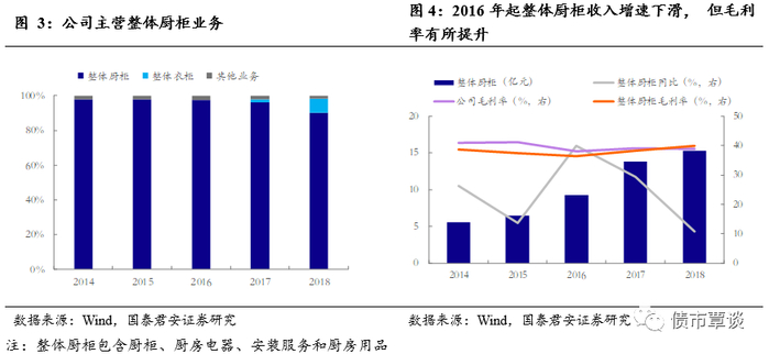 公司主营整体厨柜业务,近两年大力发展整体衣柜业务。公司经营以整体厨柜业务为主,2018年整体厨柜业务营收占比高达90%。同时,2017年公司开始大力发展整体衣柜业务,2018年整体衣柜业务营收占比上涨至8%。