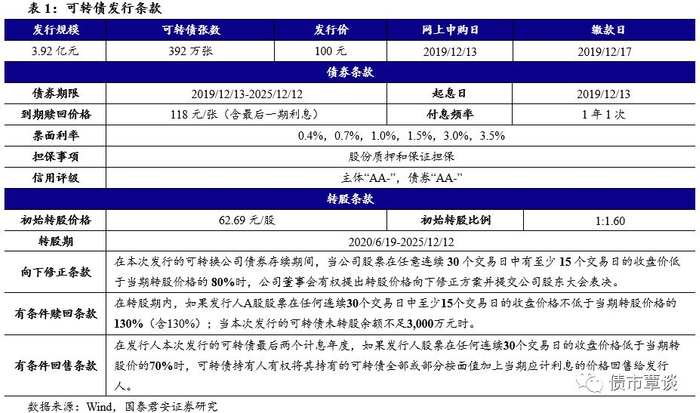发行信息:本次转债发行规模为3.92亿元,网上申购及原股东配售日期为2019年12月13日,网上申购代码为“754180”,缴款日为12月17日。公司原有股东按每股配售5.896元面值可转债的比例优先配售,配售代码为“753180”。网上发行申购上限为100万元,主承销商兴业证券最大包销比例为30%,最大包销额为11,760万元。