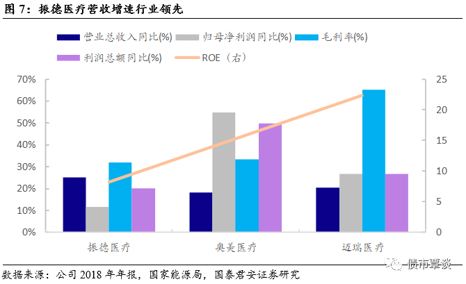 振德医疗营收增速行业领先。振德医疗的竞争对手主要有奥美医疗和迈瑞医疗。从成长能力来看,2019年前三季度振德医疗营业收入同比增长行业领先,奥美医疗的归母净利润及利润总额增速较快。从盈利能力来看,2019年前三季度奥美医疗的销售毛利率为65.21%,表现相对突出。而在细分子行业医用敷料出口方面,振德医疗则是稳居国内出口前三名。