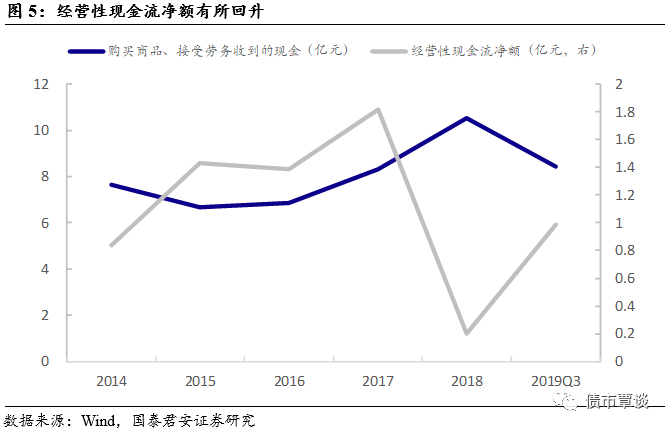 经营性现金流有所回升。公司的经营性现金流净额自2018年大幅下滑后有所回升。2018年回落主要系子公司阿拉山口振德医用纺织有限公司采购原材料进行备货导致购买商品、接受劳务支付的现金增加。2019年前三季度该项现金流出有所减少,且销售商品收到的现金及支付员工薪酬等皆有所增加,整体经营性现金流净额开始回升。