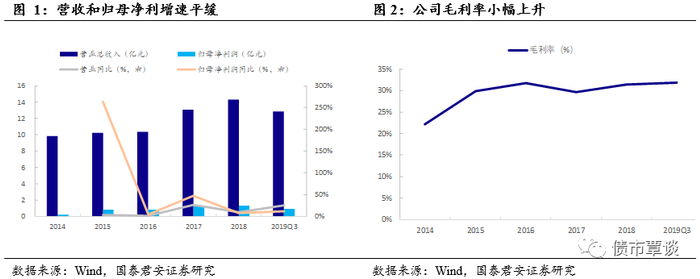 医疗行业的专业器械提供商。公司是集生产和销售为一体的医用敷料行业企业,目前产品主要包括现代伤口敷料、手术感控产品、传统伤口护理产品及压力治疗与固定产品等。随着国内医疗体制改革的不断深化,公司加快研发创新,调整相应业务结构,并充分利用进入资本市场的机会,积极应对市场变化。2018年全年营收14.29亿元,YoY+9.37%;归母净利润1.30亿元,YoY+6.93%。2019年前三季度营收12.85亿元,同比+25.02%;归母净利润0.95亿元,同比+11.56%。公司毛利率整体呈上升趋势,仅2017年有所下滑,2018年毛利率为31.36%,2019年前三季度毛利率为31.88%。