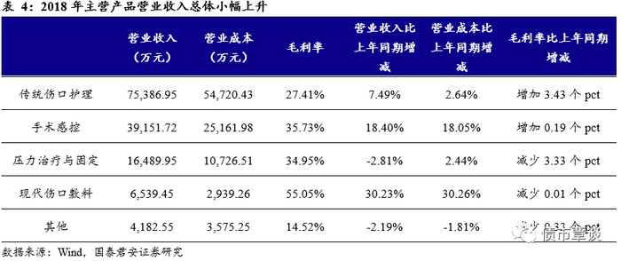 不断优化业务结构。从公司的产品分类来看,2018年营收主要由传统伤口护理、手术感控、压力治疗与固定及现代伤口敷料四种产品构成,营收占比97.05%。传统伤口护理产品为公司设立以来的主要产品,包括纱布类、无纺布类、棉类与医用护理包类四种,2018年传统伤口护理类产品实现营收7.54亿元,同比增长7.49%,营收占比53.18%;手术感控、压力治疗与固定、现代伤口敷料为公司在逐步发展过程中开发的新产品,其中现代伤口敷料近年营业收入及成本均有较大幅度的上升。从公司业务发展区域来看,境外市场成本竞争更为激烈,因此公司将眼光投入国内医疗市场,主动调整业务结构,提高在国内市场的竞争能力,实现业务快速增长。2018年境外市场营收9.69亿元,毛利率24.23%,境内市场营收4.49亿元,毛利率47.12%。
