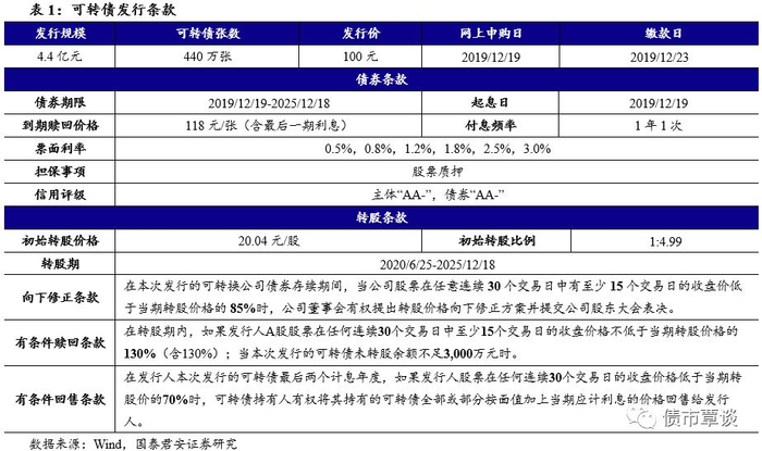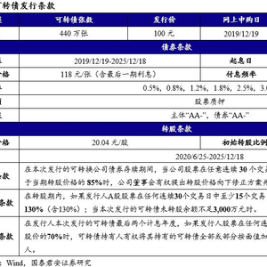 发行信息:本次转债发行规模为4.40亿元,网上申购及原股东配售日为2019年12月19日,网上申购代码为“754301”,缴款日为12月23日。公司原有股东按每股配售3.142元面值可转债的比例优先配售,配售代码为“753301”,网上发行申购上限为100万元,主承销商中信证券最大包销比例为30%,最大包销额为1.32亿元。