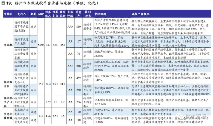 扬州市本级城投发债平台共有10家,其中市级平台4家,经开区、高新区、化工园、生态科技城等园区平台6家。市级核心平台为扬州城建,为扬州市区内规模最大、最重要的公用事业和城市基建主体,负责市城区水务、燃气、公交、房地产开发、基建及土地整理等;其子公司扬州交产、扬子江投资分别负责扬州市交通基建投资和国有资产经营。市级平台瘦西湖旅发集团,负责瘦西湖风景区开发运营,为市文旅平台。国家级扬州经开区范围有2家城投发债平台,即开发总公司和扬州绿投集团,承担经开区范围所有土地平整和配套基建。生态科技新城有2家平台,分别为扬州新盛投资和扬州易盛德产业发展公司,负责生态科技新城基建、土地开发、房地产开发等。此外,扬州化工产业园区唯一主体扬州化工,主要负责化学工业园区内基建、化工产业配套服务、供热及化工产品投资经营;而扬州高新区范围的重要城投主体盛裕投资,则从事高新区范围的市政、安置房建设等。
