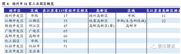 从区域分布看,市本级平台数量5家,债券余额230.8亿,占比35.7%;市级园区(经开区、高新区、化工园区、生态科技城)平台数量5家,债券余额260亿,占比40.2%;下辖的广陵区、邗江区、江都区平台各1家、2家和1家,债券余额分别12亿、32.6亿和28.4亿;宝应县、高邮县和仪征市债券余额分别24.8亿、20亿和37.6亿,合计占12.8%。