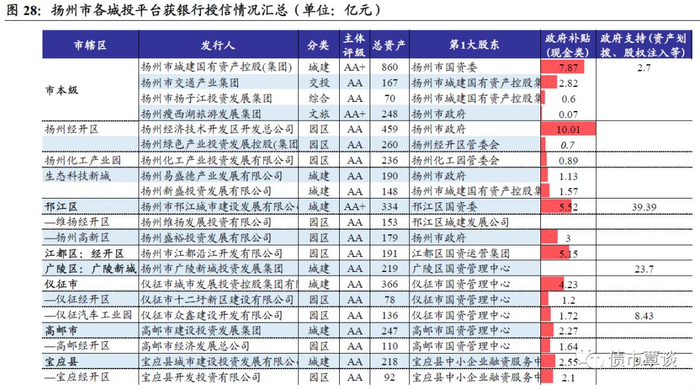 扬州市各城投平台对外担保、银行授信、政府补助、在建项目规模和未来投资压力情况梳理与对比。