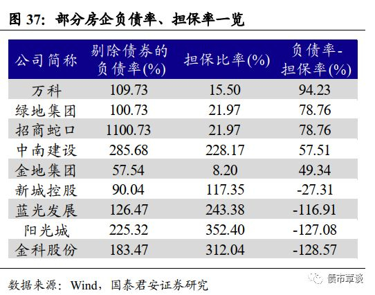 此外,通过关注对外担保识别明股实债规模。明股实债的识别关注“负债率-担保率”。如果项目融资由子公司开展,而母公司进行担保的话,会形成合并口径的高担保率,其本质是高负债率。虽然房企担保代偿风险整体有限,但负债率与担保率差距过大的房企仍然具有较大的信用风险。从房企负债率和担保率水平来看,信用资质高的房企担保率普遍较低,而激进扩张和明股实债会拉高担保率。