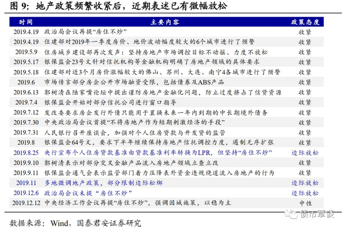 融资端来看,“房住不炒”基调未变,但融资政策的边际放松与“因城施策”下部分城市放松值得期待。今年4月份以来各部门接连释放融资收紧信号,银保监会、央行及住建部分别从融资、房地产金融政策、房价和地价等方面进行调控,继续强调“房住不炒”,政策仍以防控风险为主。但从近期政策来看,12月政治局会议未提“房住不炒”,政策有所放松,且考虑到目前宏观经济走弱趋势明显,出于保增长的需要,预计政策边际上继续收紧的概率不高。