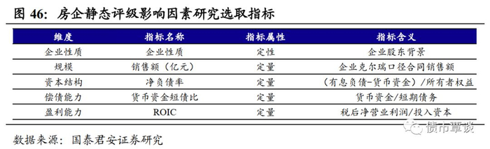 结论二:货币资金短债比对评级调整具有较好的预测能力。四个定量指标的回归结果反映出货币资金短债比对房企隐含评级动态调整的影响最为显著,房企隐含评级下调的前一年往往伴随着货币资金短债比的恶化。事实上,信用债的投资者往往对房企短期偿债能力的变动较为敏感,而货币资金短债比作为衡量企业短期偿债能力的指标,该指标的连续下降意味着房企短期偿债面临困境,因此这一指标对房企隐含评级的变动影响最为重大。