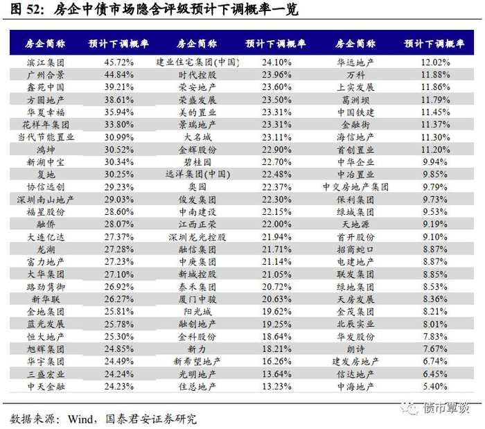 为什么采用中债隐含评级衡量房企的信用资质?中债市场隐含评级是基于中债收益率编制的,债券估价收益率大幅变动后中债隐含评级往往也随之调整,因此中债市场隐含评级可以较好地反映债券估值情况。而信用债的估值很大程度上是其信用资质的反映,因此隐含评级能够较为准确、及时地反映债项信用资质的变动,在一定程度上也能够避免传统外部评级存在的评级偏高、区分度不强等问题,是衡量房企信用资质的较好指标。