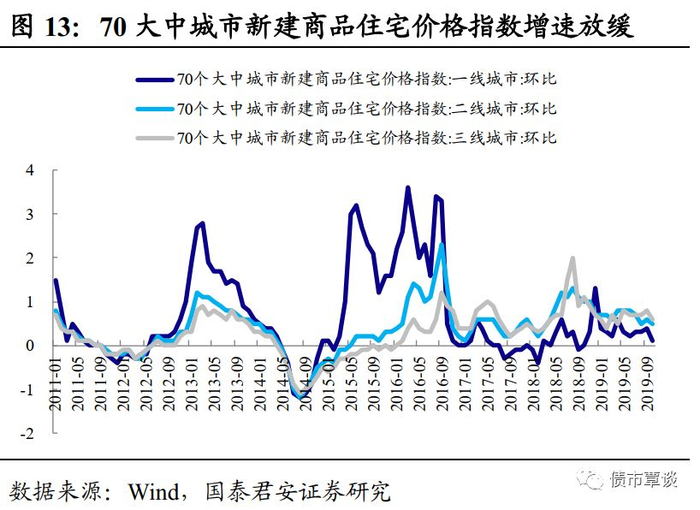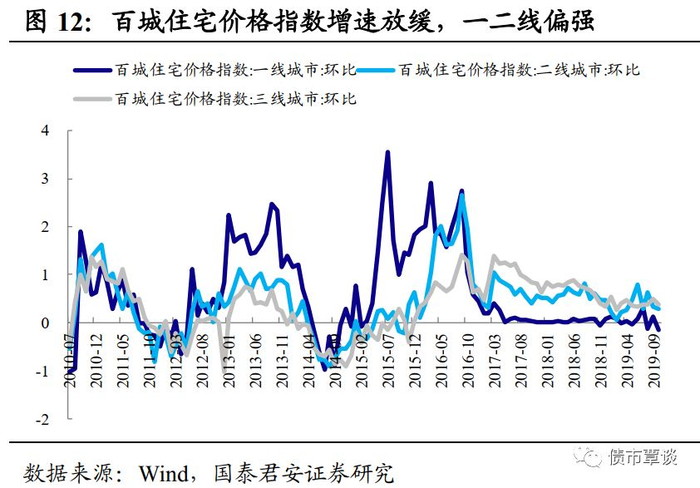 3)一二线房价稳定,对销售额增长构成支撑。2018年以来地产调控政策收紧,但一二线城市住宅价格指数增速仍有小幅回升,目前房价仍呈现温和上涨态势,可以说2019年地产销售超市场预期很大程度上是由房价上升所带来的。展望2020年我们认为一二线城市房价仍将继续支撑销售额增长。