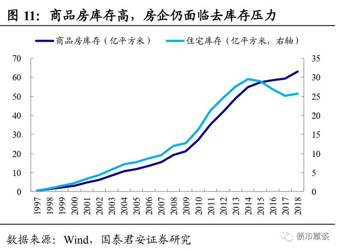 2)商品房库存虽仍然较高,但经历三年棚改已部分去化。按照每年的新开工面积-销售面积计算广义商品房库存来看,2009年以来商品房库存快速增长。2016-2018年经历了三年棚改的去化,消化了部分库存,其中住宅库存明显下降,仍需密切关注2020年是否会出现地产商进一步降价推盘的动向。