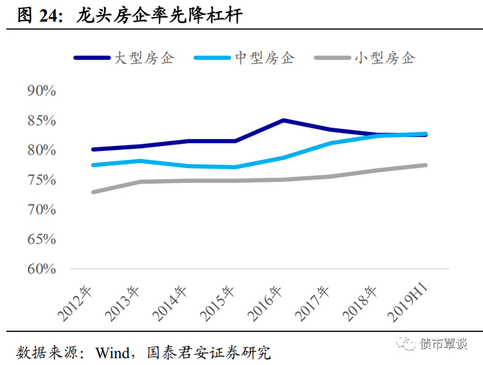 2)资本结构来看,龙头率先降杠杆。2016年大型房企放缓了加杠杆进程,并率先开启了去杠杆进程,中小型房企仍继续加杠杆,目前中型房企加杠杆速度放缓,小型房企仍处于加杠杆过程中。降杠杆可以优化资本结构,控制公司的债务风险,房企现金流质量和盈利质量相应会有所改善,从而信用风险有所降低。