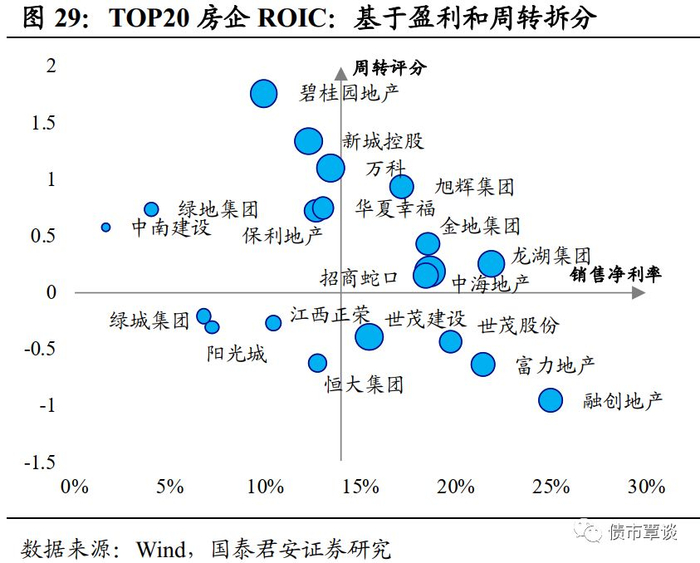 以ROIC衡量房企盈利能力,可拆分为净利与周转。盈利能力反映了房企经营结果以及自身造血能力对债务本息的覆盖能力。房企盈利能力的衡量指标为ROIC,可以拆分为净利和周转两大因素,高净利与高周转对应着高盈利能力。根据“净利-周转-ROIC”气泡图,位于第三象限的房企销售净利率、周转率都比较低,往往ROIC也较低(气泡大小),相应的,第一象限对应高净利和高周转房企,盈利能力也普遍较好。而处于第三象限的房企往往盈利能力较差,利润率与周转均表现欠佳。