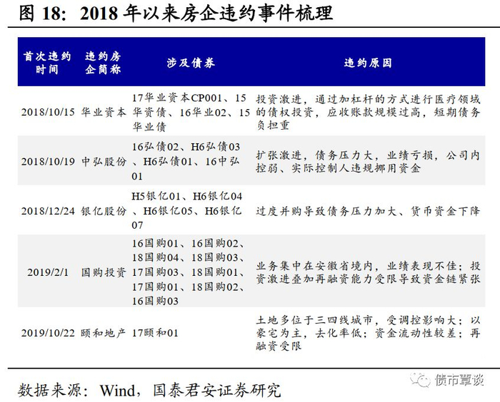 行业间对比,地产企业违约率较低,且违约集中于中小房企。根据Wind口径的余额违约率进行行业间对比,地产行业的违约率仅有0.53%,是信用风险较低的行业。目前的五起违约事件均为中小型开发商,头部房企仍然安全。2018年地产违约金身打破,华业资本、中弘、银亿、国购与颐和地产相继违约。不过五起违约事件均为中小房企,违约原因也多集中于企业投资激进、多元化失败与公司治理等问题,与地产主业关联度并不大。