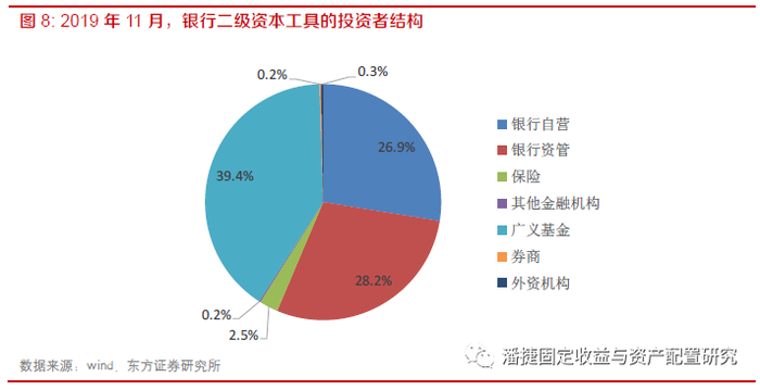 广义基金持有的银行永续债占比较低,在于对流动性的担忧。公募基金需要净值化管理,负债端稳定性较弱,因此,对流动性要求较高。而银行永续债由于期限较长,投资者较为集中,机构对流动性有所担忧。但随着未来银行永续债的流动性提升,广义基金持有银行的永续债的规模或有所提升。从银行二级资本工具的投资者结构来看,广义基金也是投资主力。