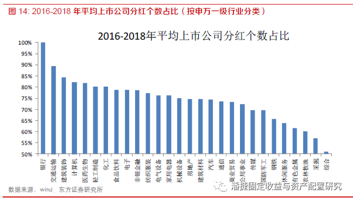 第二,建议关注分红稳定的上市银行。银行永续债的利息递延条款与普通永续债一致,即发行人若选择递延支付利息,则直至已递延利息及其孽息全部清偿完毕,不得向普通股股东分红。以申万一级行业为标准,根据2016-2018年三年平均的上市公司分红数量占比来看,银行板块的分红企业数量占比达100%,意味着所有上市的银行均保持每年稳定分红,若上市公司分红稳定,发行人发生递延付息的概率相对较低。