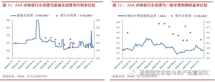 从银行永续债的发行利率来看,基本持平于同期限同评级的一般永续债,较同期限同评级的一般中票高60bp左右,虽然固定利差呈下降趋势,但仍具有一定性价比。上半年银行永续债的发行利率略高于同期限同评级的普通永续债,但由于认购持续火爆,下半年银行永续债的发行利率已持平于普通永续债,与一般中票相比,也仍具有性价比。