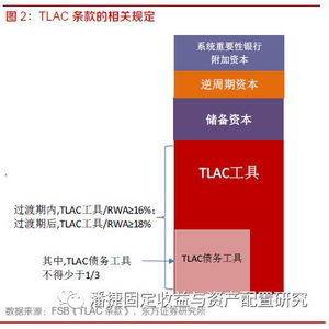 TLAC指银行在进入处置程序时,能够通过减记或转股吸收银行损失的各类资本或债务工具的总和。金融稳定理事会(FSB)在2015年11月公布的《TLAC条款》规定,从2025年1月1日起,新兴市场的全球系统重要性银行(G-SIBs)的TLAC工具占风险加权资产(RWA)的比例不低于16%,杠杆率不低于6%;2028年将分别达到18%和6.75%(我国的工商银行、农业银行、中国银行和建设银行被列入G-SIBs)。但是,《TLAC条款》还设定了提前达标的触发条件,一旦新兴市场国家的金融及非金融企业债券余额(不含政策性银行)占GDP的比重超过55%,则应从次年起的三年内落实TLAC要求。