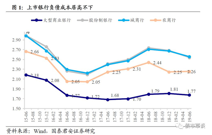 从数据来看,上市银行负债成本居高不下,2019H1平均付息负债成本率为2.28%。非上市银行中,2018年末股份行、城商行付息负债成本率分别为2.59%、2.71%,环比2017年下降,但高于2015-2016年;同期,农商行付息负债成本率为3.19%,连续四年下降。