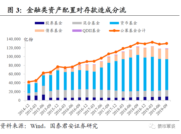 在减量博弈之下,除了传统的房地产配置意外,资管行业大爆发,各类创新型产品对居民存款造成分流。过去五年间,公募基金总份额累计增长超过200%,而随着权益类投资的“散户机构化”趋势启动,不断有超大规模股票基金超额募集并实行配售制,对居民传统资产配置,如存款、不动产等造成持续分流。