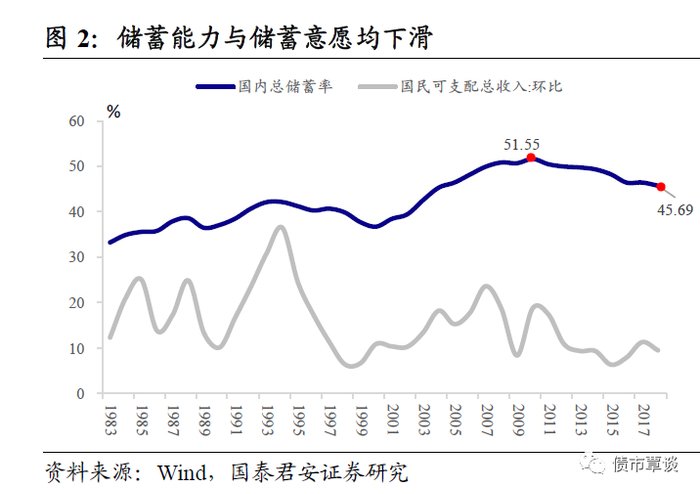 从2013年的“理财搬家”开始,我国居民储蓄意愿持续下滑,国内总储蓄率从2011年的高点51.55%降至2018年的45.69%,减少约6个百分点。而随着实际GDP增速不断放缓,居民储蓄能力边际趋弱,2018年国民可支配总收入环比增速为9.45%,较前一年下降百分点近3个百分点。