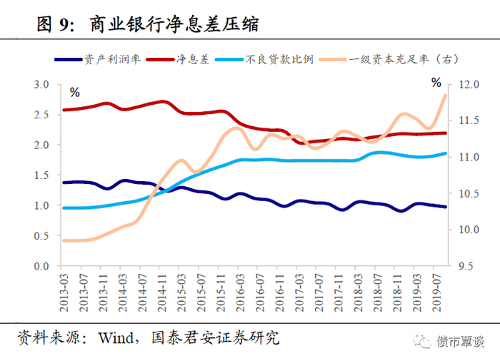 解决“融资贵”的问题要求政策多方面引导贷款利率下行,当前引入LPR形成近似于浮动贷款利率机制也是出于这一目的。而考虑到不良贷款生成(认定条件放宽尚未出明文)导致的“选择偏好”,以及存量信贷类资产证券化盘活较为缓慢不能释放出更多信贷空间,银行贷款利率也是易降难升。总体而言,作为传统业务的存贷款息差收缩趋势难以逆转。
