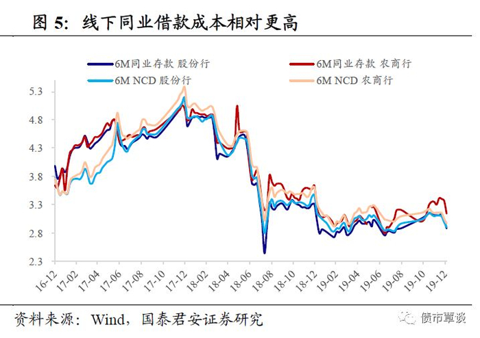 同业存单投资同业理财,以及同业之间互投的“同业套利”模式被严格监管,截至2018年12月,同业理财余额仅1.22万亿元,较2016年末的5.99万元大幅缩减。而同业存单纳入MPA考核后,中小银行通过同业负债“弯道超车”的行为被遏制。为此,不少银行转向线下的同业拆借,但场外同业借款成本相对高于发行NCD,2019年农商行6M同业借款利率(报价利率)高于同期限同业存单利率约10-20bp。