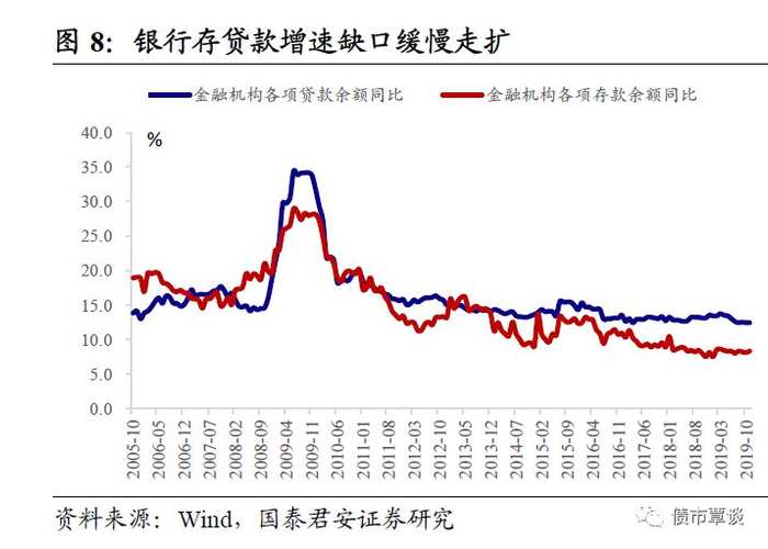 从上文对银行负债端的拆分来看,同业、表外负债增量不足、存款被资管产品分流、央行拆借既有成本又更多为定向,即便未来仍有绕道冲量的途径,大概率也会被政策打上补丁。而宽信用会持续推进几乎毫无疑问,在此过程中,存款与贷款增速的缺口缓慢走扩,大概率以存款增速持平或放缓而贷款增速小幅回升实现。