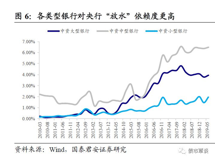 2013年以外占形式存在的储备货币规模开始萎缩,央行创设了各类货币工具对市场进行各期限的临时性流动性补充,这一趋势从上一轮宽松周期开始被不断强化。截至2019年中,中资大型、中型、小型银行向中央银行借款占总负债比重分别为3.95%、6.48%、1.96%,分别较2013年上升3.07%、4.88%、1.50%。需注意的是小型银行获得更多定向降准投放,对央行的依赖更体现于准备金存款(反映在存款科目)的上升。