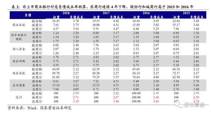 非上市银行中,2018年末股份行、城商行付息负债成本率分别为2.59%、2.71%,环比2017年下降,但高于2015-2016年;同期,农商行付息负债成本率为3.19%,连续四年下降。