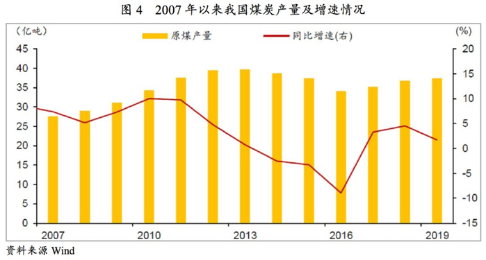 长期来看,煤炭我国能源中仍处主导地位,短期的供需紧张(且处于行业淡季)对煤炭行业整体影响不大,随着新的优质产能的释放,供给侧改革后出现的产能缺口逐步消失。2019年我国原煤产量37.46亿吨,相比2018年产量增长约1.70%,为2016年供给侧改革后连续第三年保持增长,相比供给侧改革前2013年39.74亿吨峰值仍有距离。未来煤炭供应将逐步趋于宽裕。从需求端看,2019年我国火电累计发电量5.17万亿千瓦时,累计同比增长约1.90%,相比2018全年的6.00%增速下滑明显,火电燃煤需求增速或承压。2019年我国生铁产量8.09亿吨,累计同比增速5.1%,增速仍保持在相对较高水平。综上,供给侧改革后产能缺口逐步消失,供给趋于宽裕,而主要下游火电增幅放缓,预计未来煤炭价格或将承压下滑。