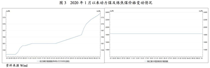 从上文对于煤炭供给和需求的分析来看,虽然整体社会煤炭储量较为充足,主要电厂长协签订比例较高,但由于本次新冠病毒疫情较为严重,各地煤矿延迟复工,加之可能对运输造成较大影响,煤炭产地供应不足;随着港口库存的消耗,动力煤价格有所上扬;而焦煤价格近期保持稳定。2020年2月3日,国家能源局综合司发布《关于做好疫情防控期间煤炭供应保障有关工作的通知》,要求加紧研判春节后煤炭市场需求走势,加强煤炭调出地与调入地的信息沟通,畅通公路运输,积极争取铁路运力支持,做好产运需三方衔接,保障全国电煤库存处于合理水平;优先安排好疫情重点地区以及东北、京津唐等地区的煤炭供应。要严格执行煤炭中长期合同及“基准价+浮动价”定价机制,严禁在合同约定以外随意涨价,严禁以各种理由不履行中长期合同,严禁限制煤炭外销。