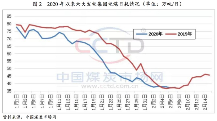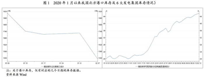 其次从社会库存看,从下图可以看出,疫情爆发后,产地开工节奏缓慢,铁路货源不足,北方港煤炭集运量偏低,导致北方几大港口库存出现大幅下降,而各大电厂由于下游各行业延迟复工,电力需求降低,煤炭日耗量较上年同期大幅下降,煤炭库存充裕;截至2020年2月12日,沿海六大电力集团主要电厂存煤1,705.1万吨,较年初上涨超150万吨,可用库存在44天以上,高于2019年2月12日的37天可用库存,且考虑到部分煤炭企业已经复工(2月11日,国务院应对新型冠状病毒感染肺炎疫情联防联控机制举行新闻发布会上提到:截至2月10日,煤矿复产率达到57.8%),煤炭整体供应有保障。