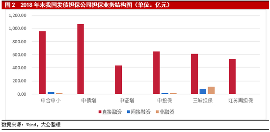 业务结构:间接融资担保业务规模继续收缩,以债券担保为主的直接融资担保整体快速增长,已成为大中型融资担保公司最主要业务构成;