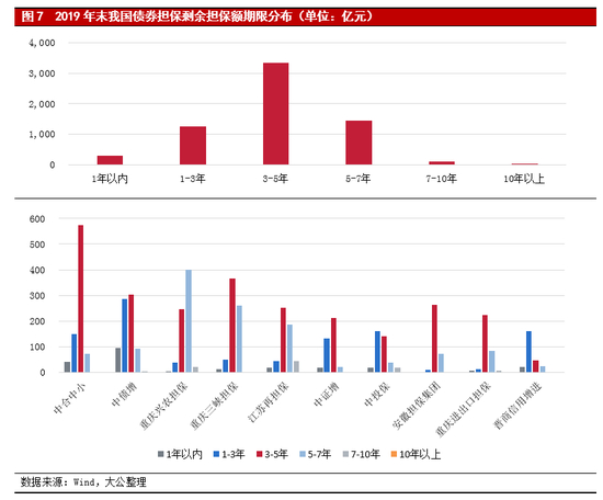 因担保公司非负债经营,其负债规模较小,主要包括应付职工薪酬、应缴税费以及在开展担保业务过程中依照监管要求所提取的担保赔偿准备金和未到期责任准备金等。一般来说,担保公司的流动性压力主要来自于担保业务代偿产生的或有债务压力。截至2019年末,担保公司担保债券的到期期限集中在1年以上,其中在2022-2024年集中到期的债券规模合计3,348.87亿元,占担保债券总额的51.75%。2019年末担保债券规模排名前十大的担保公司中,重庆兴农融资担保集团有限公司债券担保剩余期限以5-7年为主,晋商信用增进投资股份有限公司债券担保剩余期限以1-3年为主,其他担保公司担保债券均集中在3-5年为主。整体来看,对于以债券担保为主的大中型担保公司来说,短期内担保业务带来的流动性压力较小。