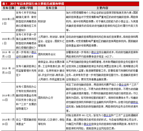 2019年以来,为切实达到“支小支农”的目标,国务院发布《关于有效发挥政府性融资担保基金作用切实支持小微企业和“三农”发展的指导意见》,规定了政府性融资担保、再担保公司的业务范围和规模,引导其坚守支小支农融资担保主业。2019年10月,融资性担保业务监管部际联席会议成员单位联合印发了《融资担保公司监督管理补充规定》(以下简称“《补充规定》”),《补充规定》保持与现有法规相衔接,要求融资担保公司监督管理部门承担主体监管责任,将未取得融资担保业务经营许可证但实际上经营融资担保业务的住房置业担保公司、信用增进公司等机构纳入监管。此次《补充规定》的发布,填补了信用增进公司的监管空白,有利于进一步规范融资担保经营行为,促进融资担保行业稳健运行。2020年初,政府相关部门为保障疫情期间的金融支持,颁布多条举措优化融资担保服务,要求融资担保机构通过降低保费、取消反担保要求、延长追偿时限等方式降低小微企业融资成本,助力小微企业尽快恢复正常生产经营。