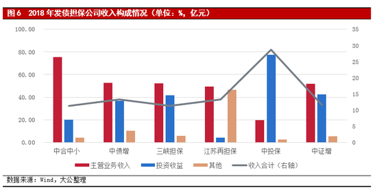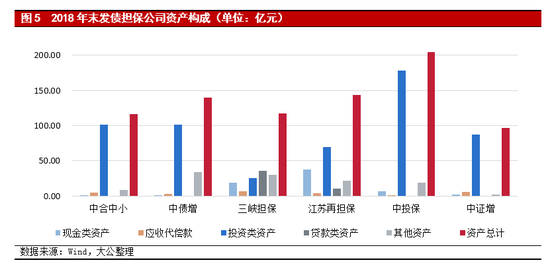 在非担保业务方面,担保公司是资金密集型企业,为保证流动性和收益的双重需要,担保公司会利用自有资金开展投资业务。担保公司的投资业务通常包括委托贷款、政府主导下的股权投资(产业基金投资、区县级政策性担保公司入股等)、安全性较高的固定收益投资(国债、金融债券、大型企业债务融资工具、金融机构理财产品等)和其他投资。截至2018年末,6家发债担保公司的资产构成以现金类资产 、应收代偿款、投资类资产和贷款类资产为主,且投资类资产和贷款类资产合计占比均超过资产的50%。其中中证增的投资类资产占资产总额的90.12%,三峡担保的贷款类资产占资产总额的30.98%。一方面,宏观经济下行压力犹存,以及债券市场违约常态化,担保公司的投资类资产和贷款类资产的质量仍面临一定挑战。另一方面,为引导融资担保公司专注主业、审慎经营,确保融资担保公司保持充足代偿能力,2018年4月出台的监管新规对担保公司资产配置能力提出更高要求,部分自有资金投资比例超标的担保公司面临较大的资产构成调整压力。